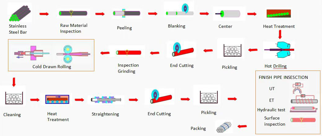 تحتوي الأنابيب غير الملحومة المصنوعة من الفولاذ المقاوم للصدأ على قسم مجوف ولكن بدون طبقات. إنها مصنوعة من الفولاذ المقاوم للصدأ المستدير عن طريق الدرفلة على الساخن أو معالجة البثق الساخن، ومن ثم عن طريق الدرفلة على البارد أو السحب على البارد.